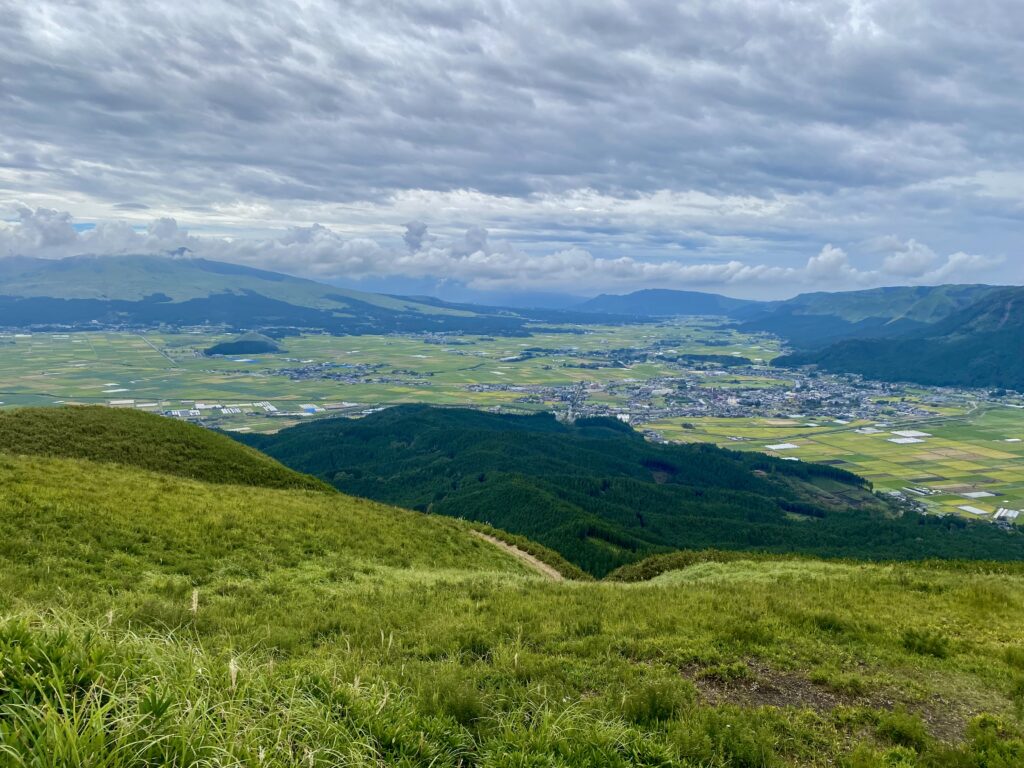 阿蘇のカルデラ全体を見渡せるパノラマの絶景に、圧倒されます。草原がぐるりと広がり、まさに“地球の広さ”を実感できるスポット。