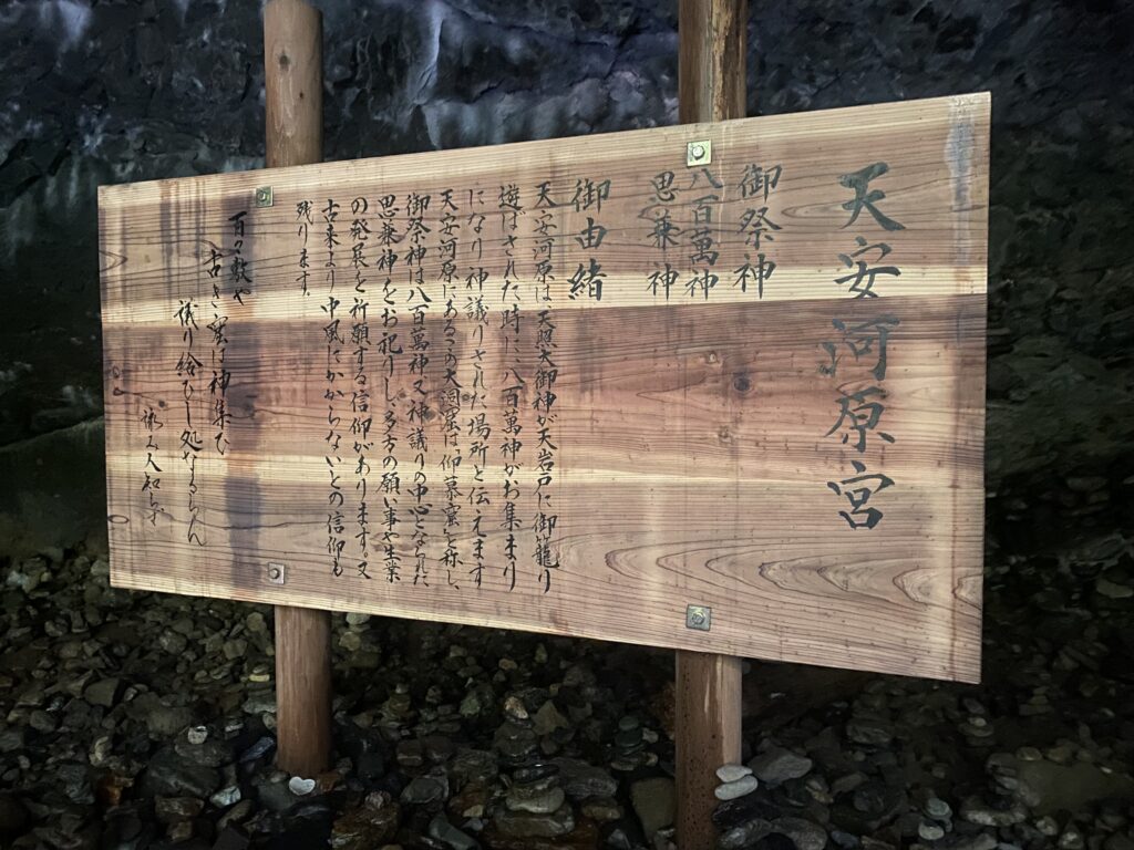 天照大神が天岩戸にお隠れになられた時に八百萬神がお集まりになり神議りされた場所です。