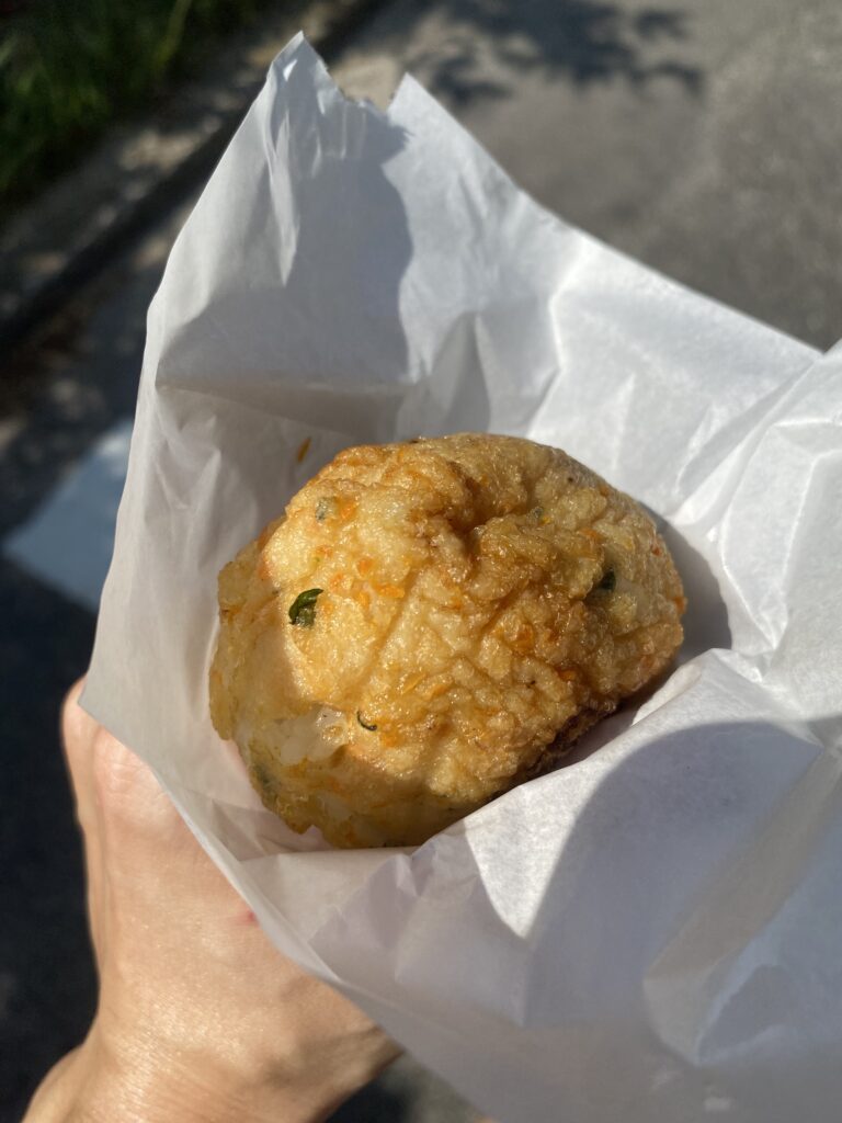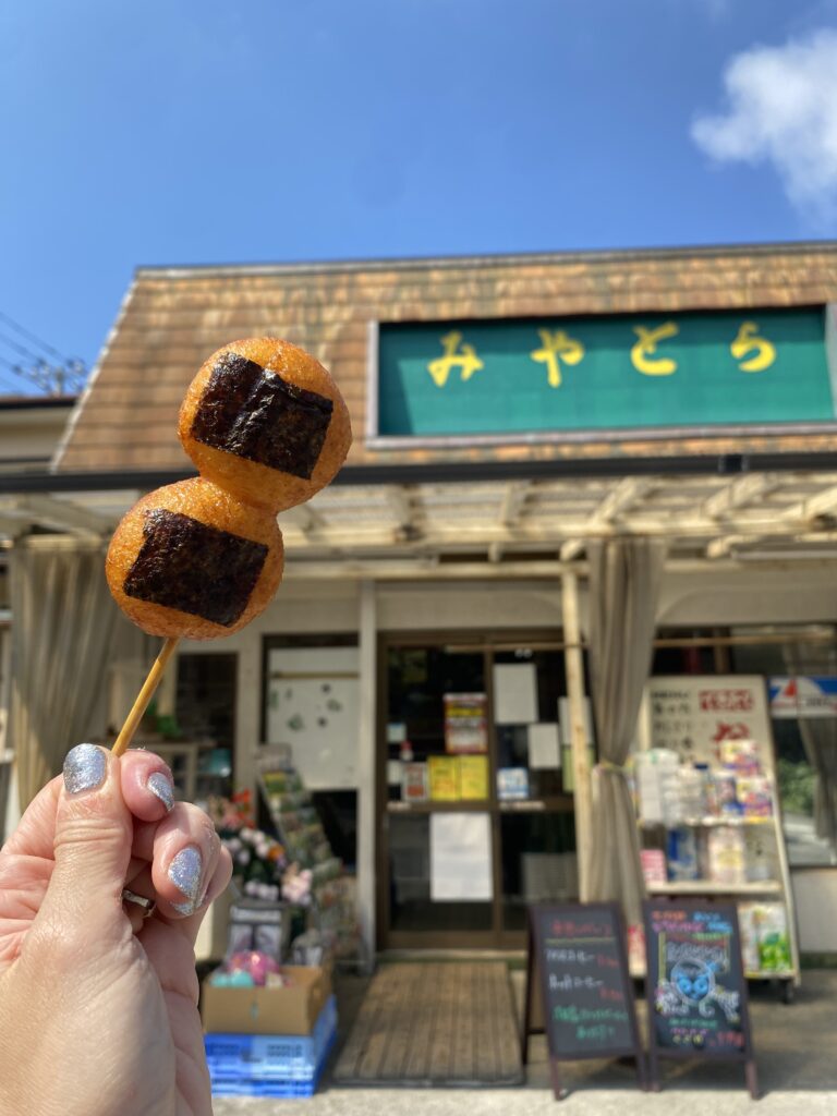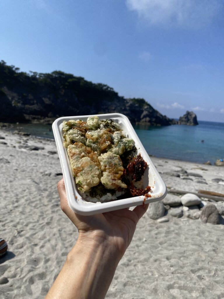 ここでの名物が「たたき丸」。魚のすり身で包まれたおにぎりで、素朴だけどやみつきになる味。のり弁や揚げ餅も買って、海辺でランチを楽しみました。