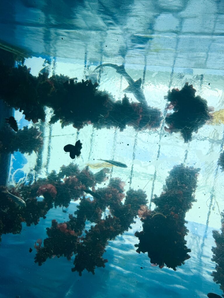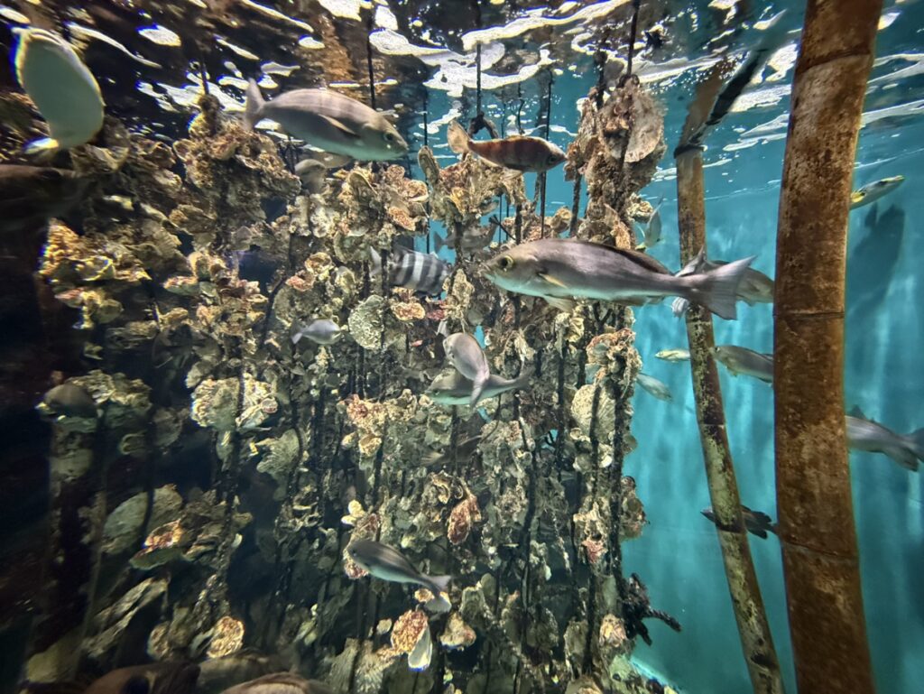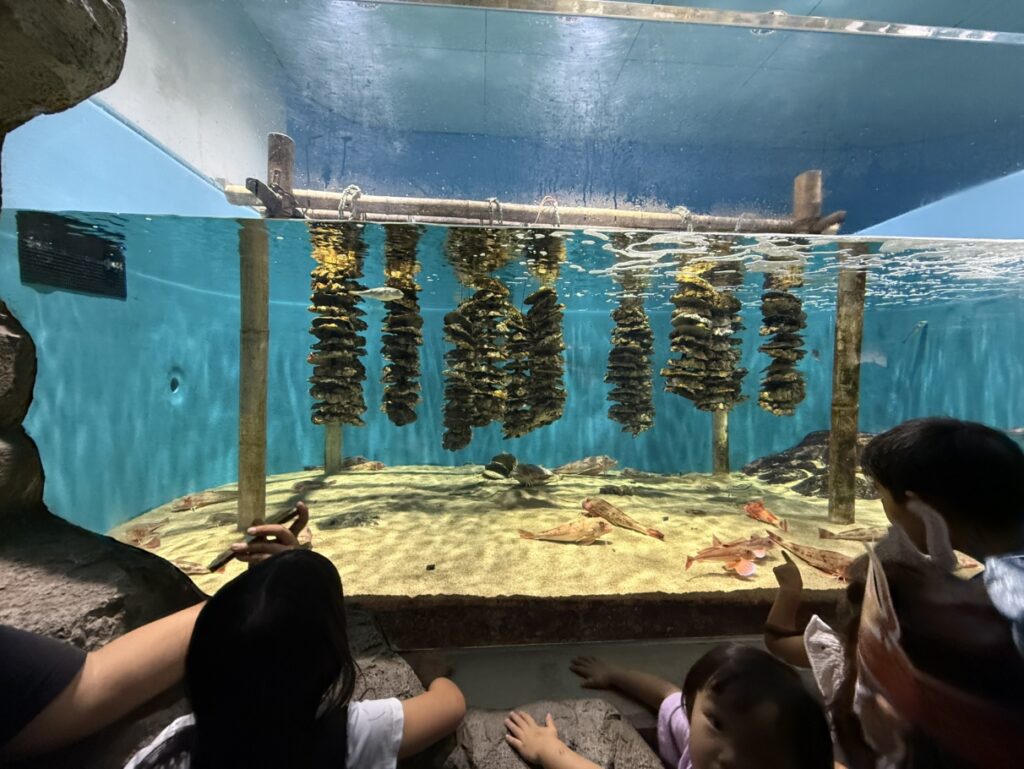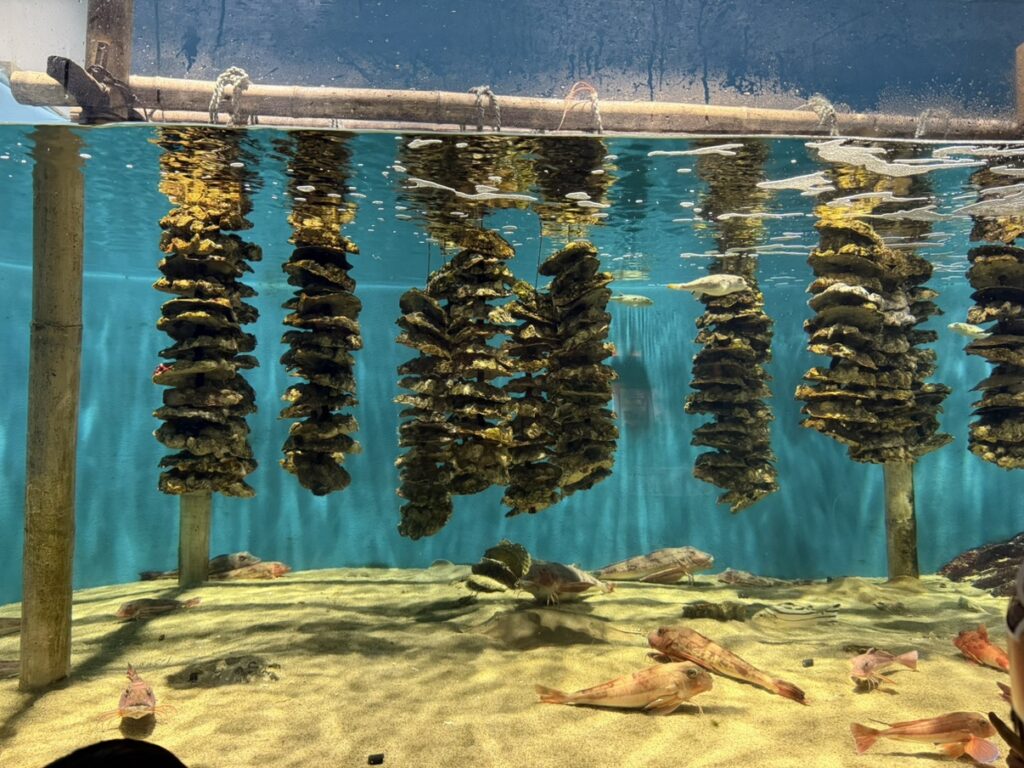 垂直に牡蠣が吊るされ、それを隠れ蓑にしている魚たちがたくさんいました!