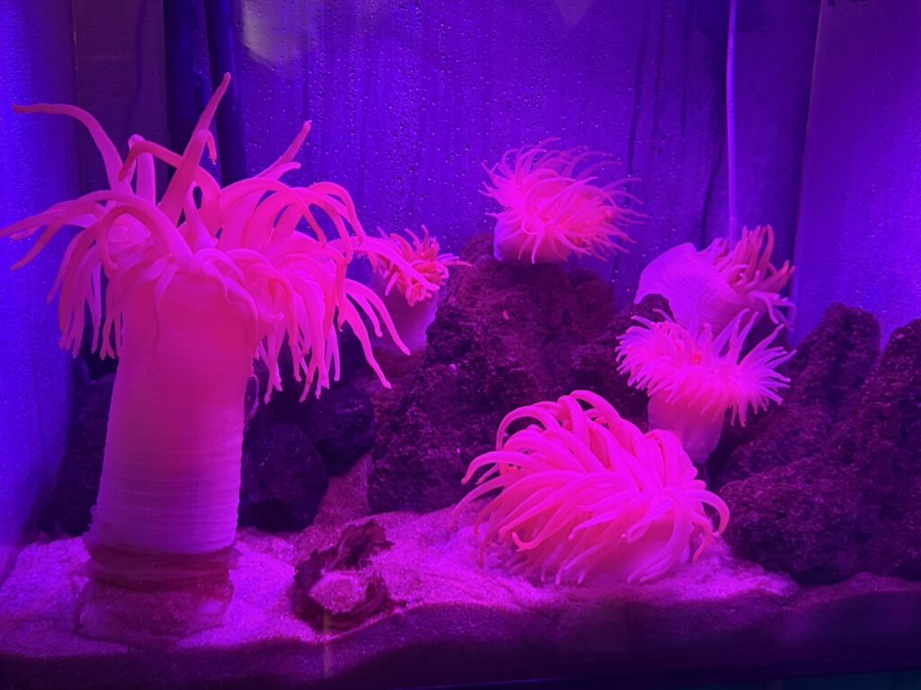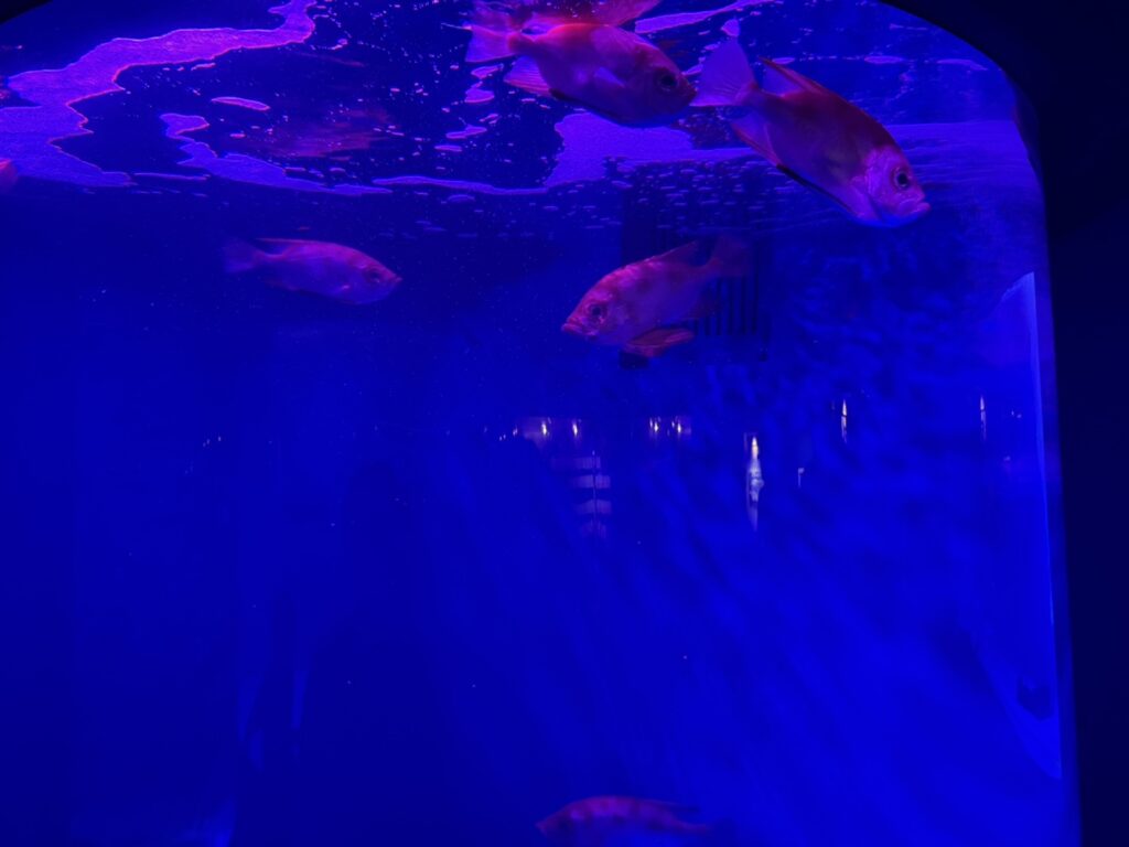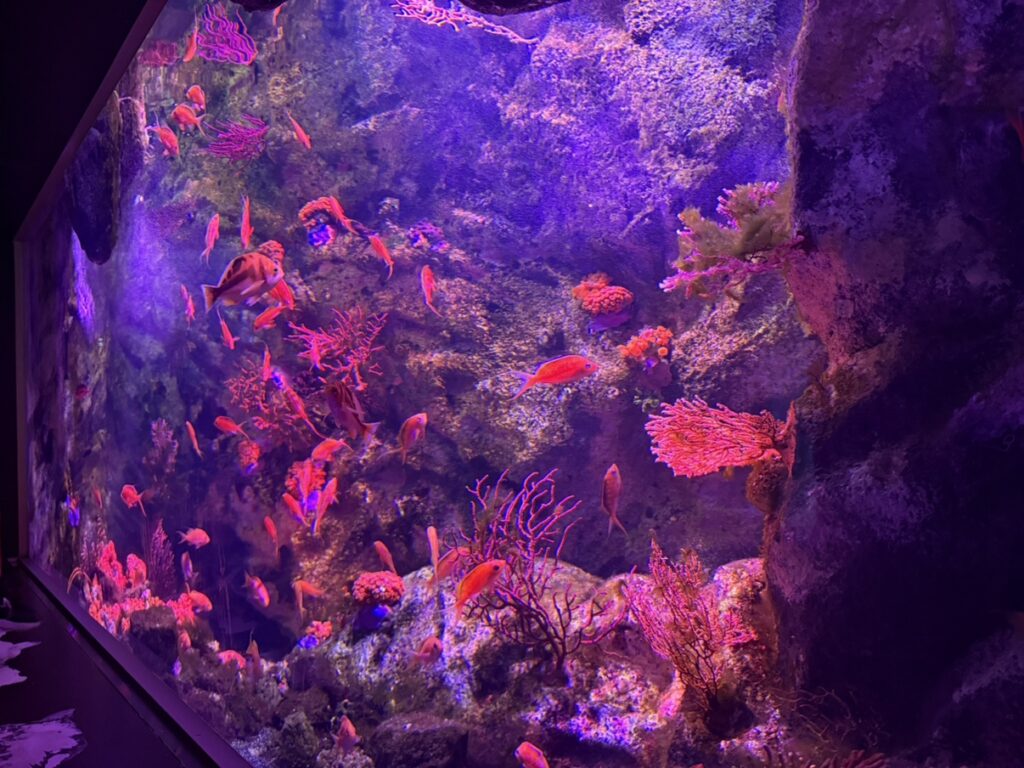 色んな種類の生き物が太陽の光で色鮮やかにきらめく圧倒の水槽です!
