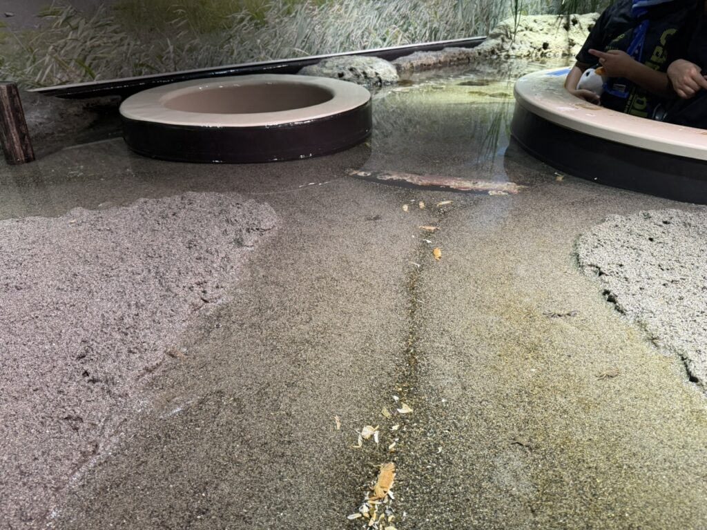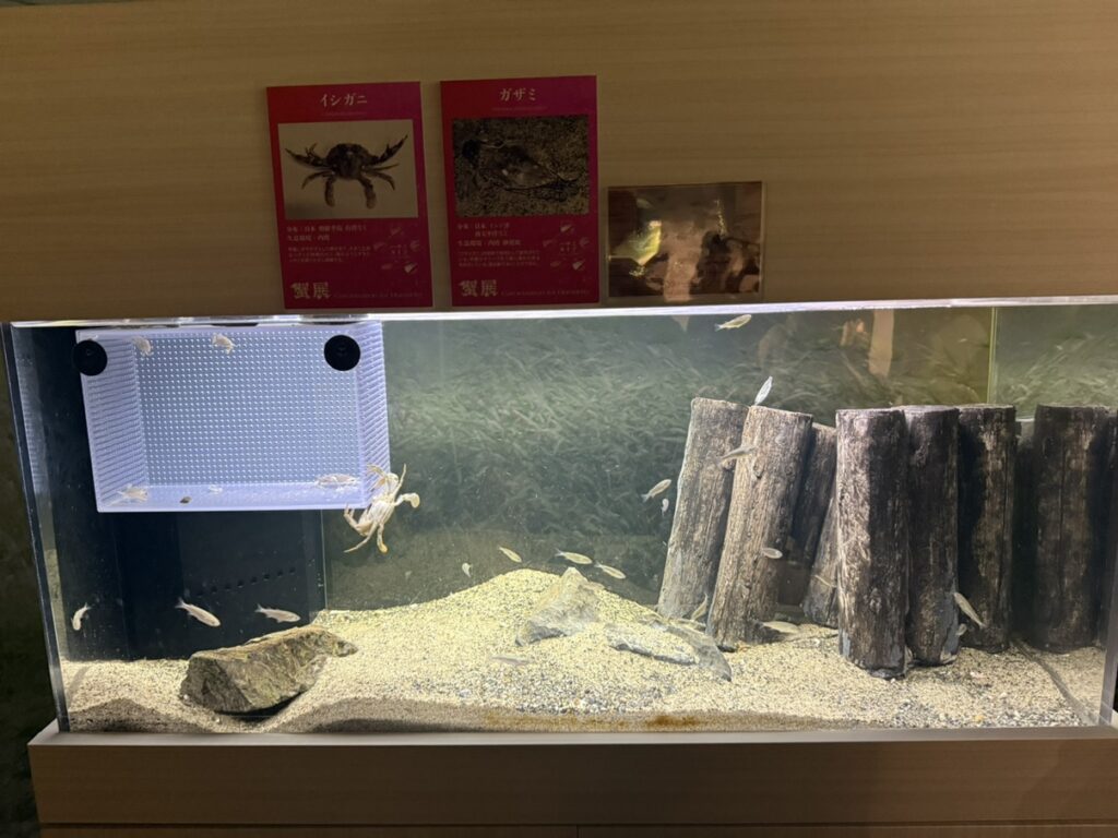 干潟を再現した水槽に干潟目線になれる穴がありそこから顔をだし、干潟の生き物を観察できるエリアです!